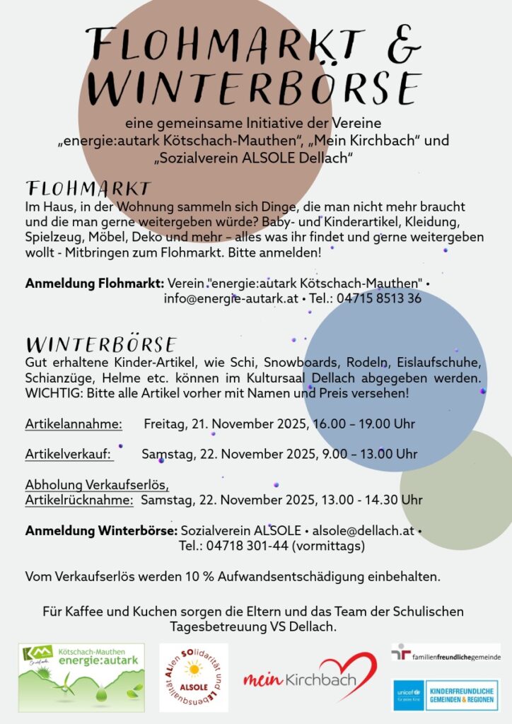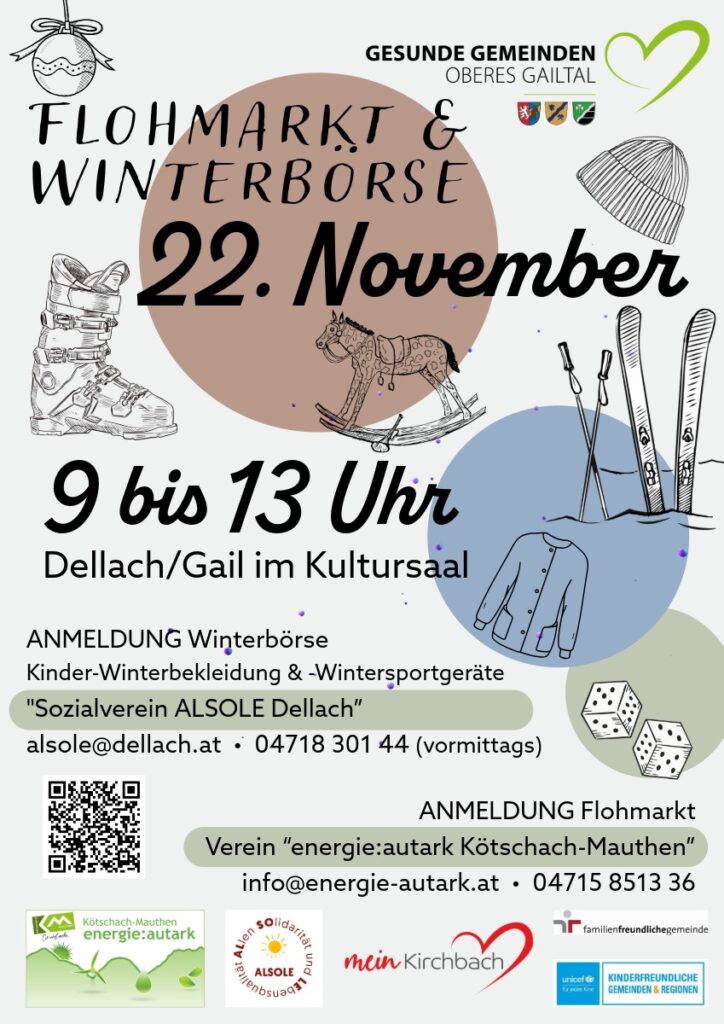 Gut erhaltene Kinder-Artikel, wie Schi, Snowboards, Rodeln, Eislaufschuhe, Schianzüge, Helme etc. können im Kultursaal Dellach abgegeben werden.